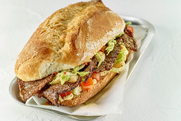 Ochsenfetzen Grill Sandwich aus dem energieautarken Foodtruck. Das Ochsenfleisch liefert eine Landmetzgerei aus dem Münchner Umland, die Sauce ist eine Eigenkreation, die Bio-Krustensemmel mit Tomate und Salat schmeckt klasse.